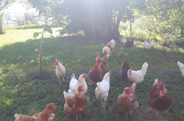 Es sind dies eine Mutterkuhherde, ein paar Mutterschweine drei Pferde und Legehennen. Alle haben so viel Weidegang wie möglich.