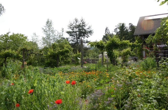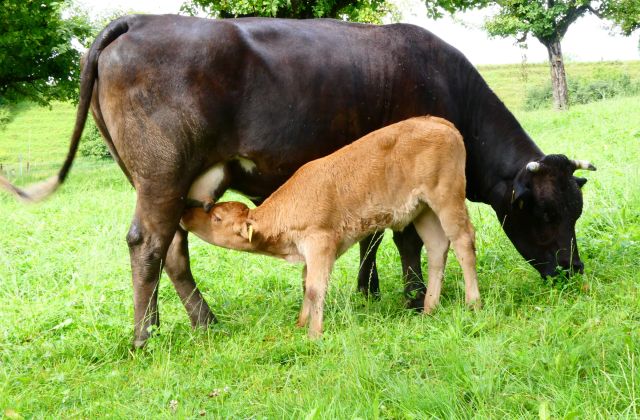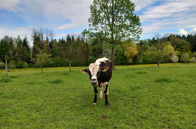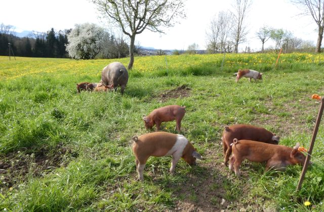 Es sind dies eine Mutterkuhherde, ein paar Mutterschweine drei Pferde und Legehennen. Alle haben so viel Weidegang wie möglich.